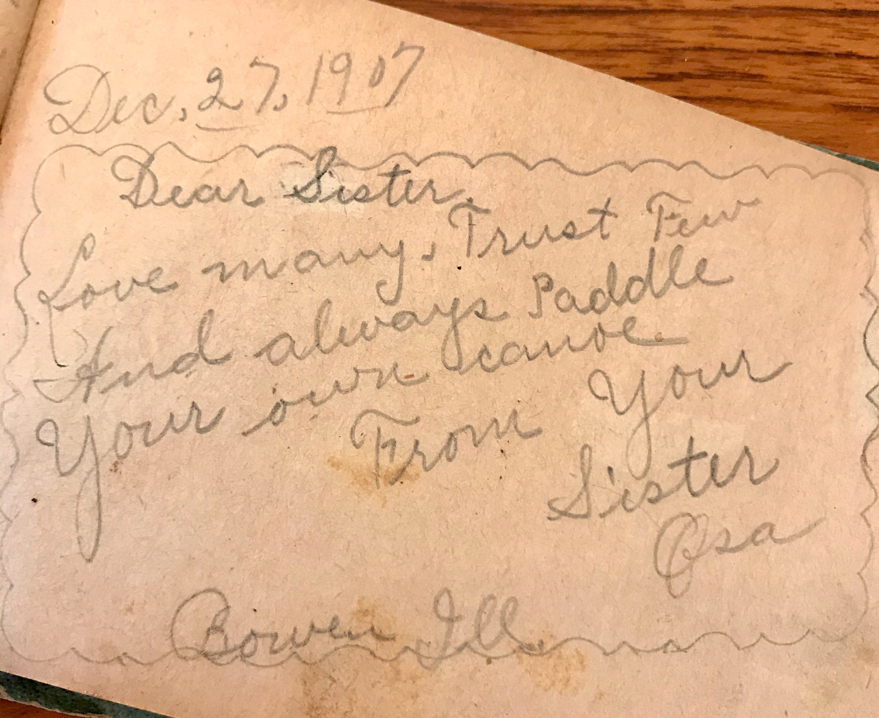 My grandmother and great aunt are two of the most amazing women I’ve ever known. They were fun, smart and, oh, so loving. Who knew they were also fashionistas?! Aunt Osa’s thoughts that she wrote in my Grandma Velma’s memory book are so insightful for a teenager. A lot of pages had rhymes and “you’re so great” comments, but her words spoke to how she lived her life well into her later years. I wish I had seen this when they were both alive so we could’ve discussed it. I miss them both…